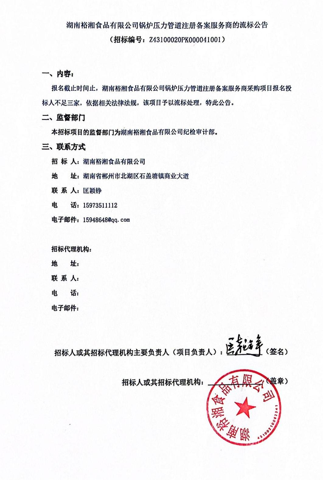 湖南裕湘食品有限公司锅炉压力管道注册备案服务商的流标公告